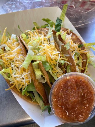 Ground beef fried on a corn tortilla topped with fresh lettuce and cheese, Daniela's Salsa.